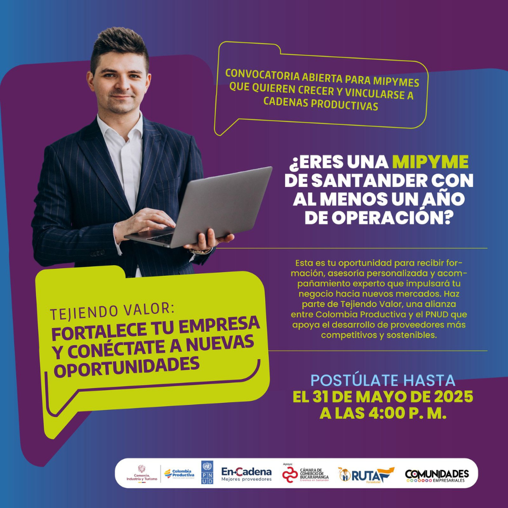Si tienes una MIPYME en Santander con al menos un año de operación, postúlate a Tejiendo Valor y accede a formación, asesoría personalizada y apoyo para conquistar nuevos mercados, con el respaldo de Colombia Productiva, PNUD y la Cámara de Comercio de Bucaramanga.